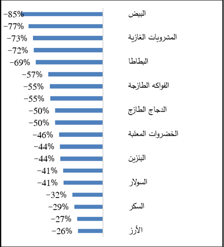 انخفضت أسعار السلع الآتية بشكل ملحوظ في قطاع غزة لتبلغ بالمتوسط؛ البيض 90 شيكلاً/كرتونة 2كغم، والبصل الجاف والبطاطا 5 شواكل/كغم لكل منهما، والثوم الجاف 15 شيكلاً/كغم، والكولا 11 شيكلا/330مل، والقهوة 80 شيكلاً/كغم، والسميد والسكر 5 شواكل/كغم لكل منهما، والبرتقال 7 شواكل/كغم، والليمون 9 شواكل/كغم، والتفاح 12 شيكلاً/كغم، والجوافة 17 شيكلاً/كغم، والرمان 21 شيكلاً/كغم، والافوكادو 10 شواكل/كغم، ولحم عجل مجمد 63 شيكلاً/كغم، والدجاج 36 شيكلاً/كغم، والبندورة والباذنجان والخيار والموز 11 شيكلاً/كغم لكل منها، والكوسا 14 شيكلاً/كغم، والفلفل الحار 33 شيكلاً/كغم، والفليفلة الحلوة 10 شواكل/كغم، السبانخ 7 شواكل/كغم، وعلبة فول 3 شواكل/380غم، والمياه المعدنية 5 شواكل/1.5لتر، والبنزين "95" 140 شيكلاً/لتر، والملح 3 شواكل/كغم، والسولار 39 شيكلاً/لتر، والطحين 88 شيكلاً/25كغم، وزيت الزيتون 42 شيكلاً/كغم، وزيت عباد الشمس 24 شيكلاً/3لتر، وأرز مصري 4 شواكل/كغم.