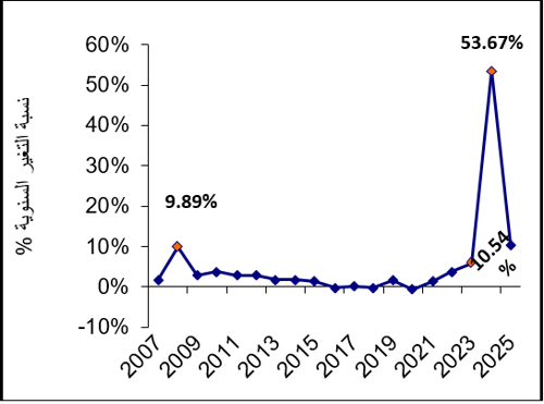 نسب التغّير السنوية لأسعار المستهلك في فلسطين للسنوات: 2007 – 2025