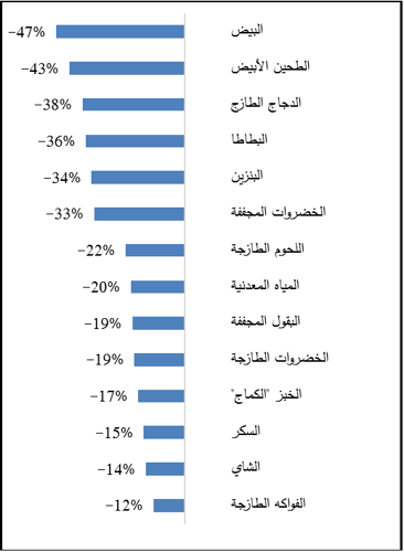 انخفضت أسعار السلع الآتية بشكل ملحوظ في قطاع غزة لتبلغ بالمتوسط؛ البيض 47 شيكلاً/كرتونة 2كغم، والطحين 51 شيكلاً/25كغم، والدجاج 27 شيكلاً/كغم، والبصل الجاف والبطاطا 3 شواكل/كغم لكل منهما، والبنزين "95" 92 شيكلاً/لتر، ولحم العجل المجمد 49شيكلاً/كغم، ومياه معدنية 4 شواكل/1.5لتر، والعدس 8 شواكل/كغم، والفاصولياء 5 شواكل/كغم، والباذنجان 7 شيكلاً/كغم، والكوسا والموز 10 شيكلاً/كغم لكل منهما، والفلفل الحار 15 شيكلاً/كغم، وخبز كماج 3 شواكل/ربطة 2كغم، والسكر 4 شواكل/كغم، والشاي 13 شيكلاً/بكيت 100كيس، والبرتقال والليمون 6 شواكل/كغم لكل منهما.