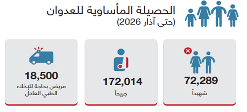 وفي رصدٍ مأساوي لحجم الإبادة والنزيف البشري المستمر، تشير المعطيات إلى أن العدوان المستمر منذ تشرين الأول/أكتوبر 2023 أسفر حتى آذار/مارس 2026، عن أكثر من 72,280 شهيداً، إضافة إلى ما يزيد على 172,000 جريحاً، يُقدّر أن نحو ربعهم يعانون من إصابات دائمة تتطلب خدمات إعادة تأهيل طويلة الأمد. وتشير تقديرات اليونيسف إلى أن أكثر من 21000 طفل من بين الضحايا، إضافة إلى ما يزيد على 11,000 طفل يعانون من إعاقات دائمة وإصابات غيرت مجرى حياتهم، وهم بحاجة ماسة إلى برامج إعادة تأهيل طويلة الأمد غير متوفرة في ظل الظروف الحالية.