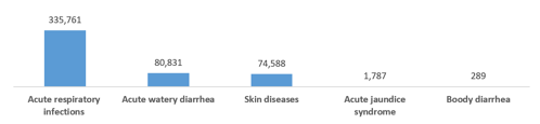 Acute watery diarrhea was the second most reported condition at 16%, with around 81,000 cases recorded from January through the end of February 2026, including more than 36,000 cases among children under five. During 2025, more than 496,000 cases of acute watery diarrhea were reported, with 47% of them among children under five years of age.