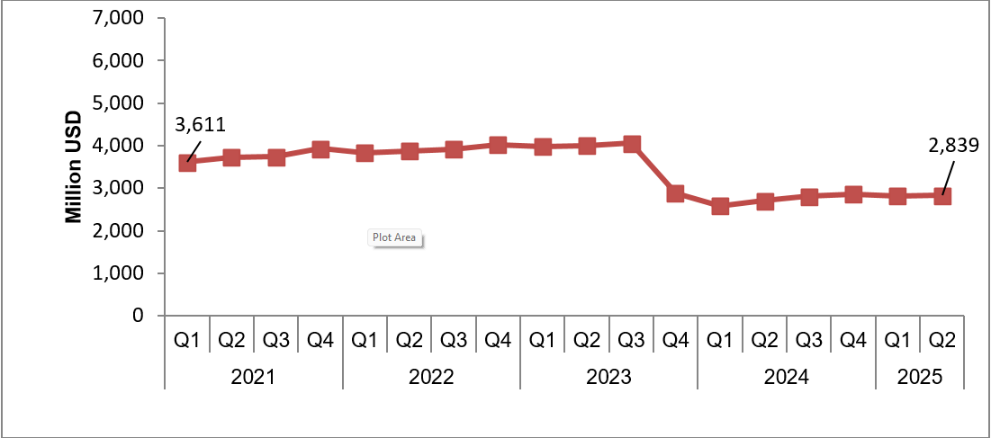 The sharp decline in GDP per Capita for Palestine continued in the second quarter of 2025 compared to the same quarter of 2023.