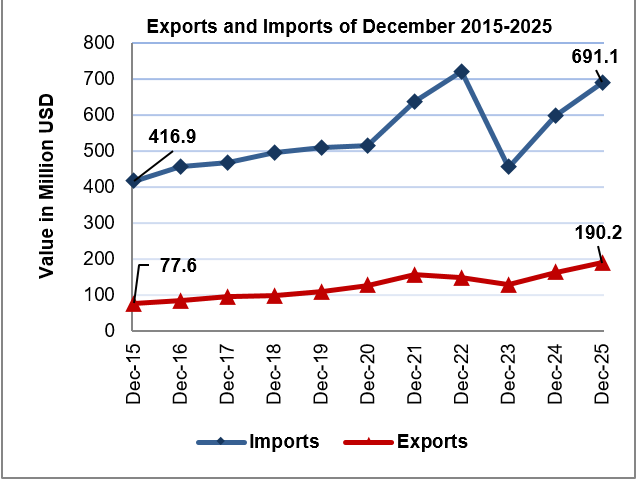 Imports increased in December, 2025 by 15% compared to December, 2024 and reached USD 691.1 Million.