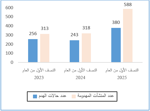 عدد عمليات الهدم والمنشآت المهدومة من قبل الاحتلال الإسرائيلي في الضفة الغربية خلال النصف الأول من الأعوام 2023-2025
