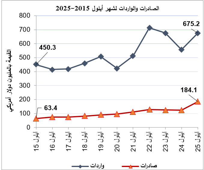 أما الميزان التجاري والذي يمثل الفرق بين الصادرات والواردات، فقد سجل ارتفاعاً في قيمة العجز بنسبة 14% خلال شهر أيلول من عام 2025 مقارنة مع شهر أيلول من عام 2024، حيث بلغت قيمة العجز 491.1 مليون دولار أمريكي.
