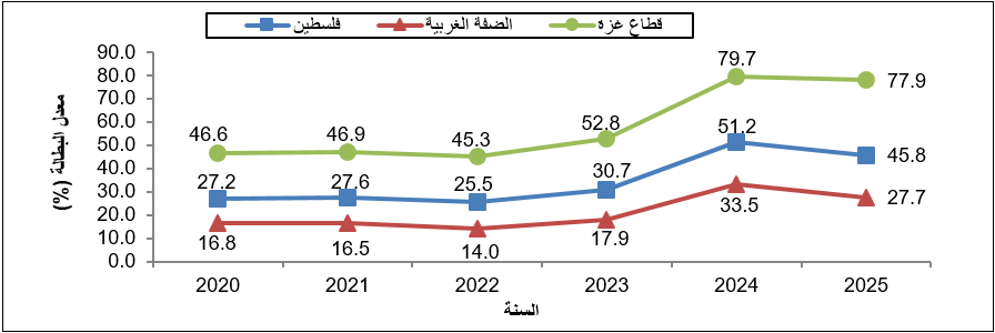 تعطل حوالي نصف القوى العاملة في فلسطين حيث بلغ معدل البطالة 46% خلال العام 2025، بواقع 28% في الضفة الغربية و 78% في قطاع غزة. وهو ما يعكس المستوى المرتفع في معدلات البطالة في الضفة الغربية وقطاع غزة رغم التغيرات الطفيفة في تلك النسب حيث بلغ عدد العاطلين عن العمل اكثر من 650 الف متعطل عن العمل.