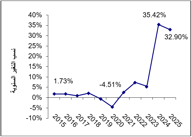 نسب التغّير السنوية لأسعار المنتج في فلسطين للسنوات 2015 – 2025