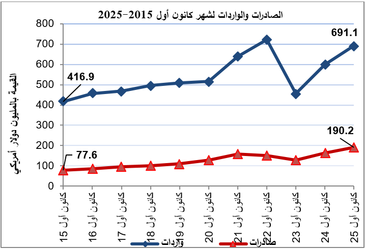 ارتفعت الواردات خلال شهر كانون أول من عام 2025 بنسبة 15% مقارنة مع شهر كانون أول من عام 2024، حيث بلغت قيمتها 691.1 مليون دولار أمريكي.