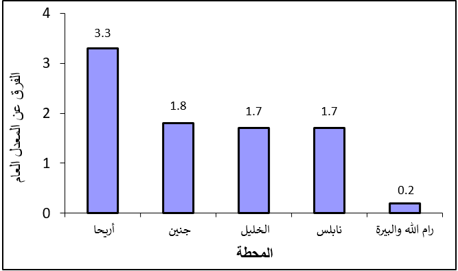 الفرق في درجات الحرارة (مo) للعام 2025 عن المعدل العام لبعض المحطات في الضفة الغربية