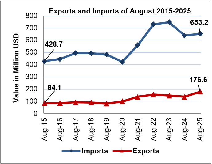 Imports increased in August, 2025 by 2% compared to August, 2024 and reached USD 653.2 Million.