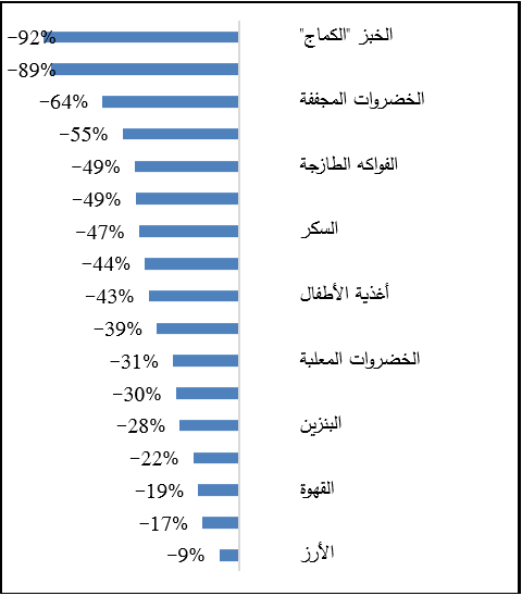 الشكل الآتي يوضح نسب التغير الشهرية لبعض المجموعات الفرعية التي انخفضت بشكل ملحوظ في قطاع غزة لشهر تشرين أول 2025: