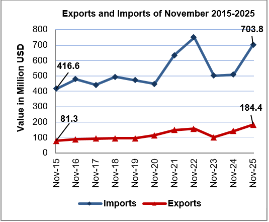 Imports increased in November, 2025 by 39% compared to November, 2024 and reached USD 703.8 Million.