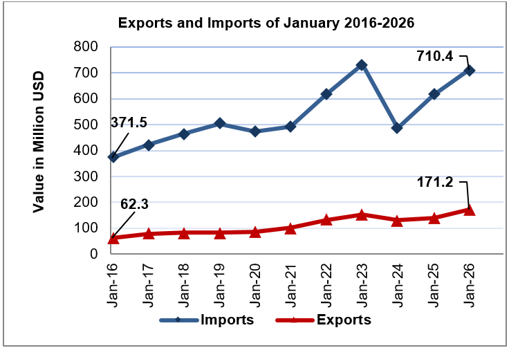 Imports increased in January, 2026 by 15% compared to January, 2025 and reached USD 710.4 Million.