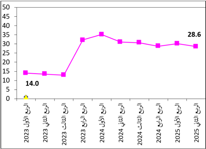 ارتفاع عدد العاملين من الضفة الغربية (لا يشمل العاملين في الخارج) من حوالي 691 ألف عامل في الربع الأول 2025 الى حوالي 714 ألف عامل في الربع الثاني 2025 بنسبة حوالي 3%.