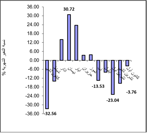 يعود هذا الانخفاض إلى انخفاض أسعار مجموعة المواد الغذائية والمشروبات غير الكحولية بمقدار 1.82%، حيث انخفضت أسعار كل من؛ البطاطا بمقدار 36.64%، والخضروات المجففة بمقدار 27.78%، والخضروات الطازجة بمقدار 15.23%، والسكر بمقدار 10.41%، والدجاج الطازج بمقدار 10.31%، والدقيق الأبيض بمقدار 1.53%.