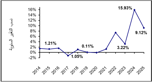 نسب التّغير السنوية لأسعار الجملة في فلسطين للسنوات: 2014–2025