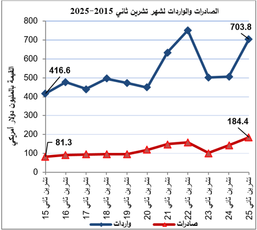 ارتفعت الواردات خلال شهر تشرين ثاني من عام 2025 بنسبة 39% مقارنة مع شهر تشرين ثاني من عام 2024، حيث بلغت قيمتها 703.8 مليون دولار أمريكي.