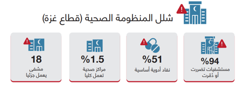 تشير البيانات المحدّثة حتى آذار 2026 إلى وصول المنظومة الصحية في قطاع غزة إلى حالة انهيار حاد، حيث طال الدمار 94% من المستشفيات، ما أدى إلى خروج المستشفيات الـ 36 كافة عن طاقتها التشغيلية الكاملة، فيما يعمل 18 مستشفى بشكل جزئي فقط؛ كما سجلت خدمات الرعاية الصحية الأولية تراجعاً كارثياً في أدائها، انخفض إلى أقل من نصف قدرتها التشغيلية، حيث لا يعمل سوى 1.5% منها بكامل طاقتها. وتزداد حدة الأزمة مع نفاد 51% من الأدوية الأساسية التي وصلت 'رصيد صفر' في المستودعات، ما يضع آلاف المرضى، لا سيما ذوي الأمراض المزمنة، أمام عجز حاد في الحصول على العلاج المنتظم، ويجعل المنظومة الصحية في حالة شلل شبه تام يضع حياة السكان على المحك.