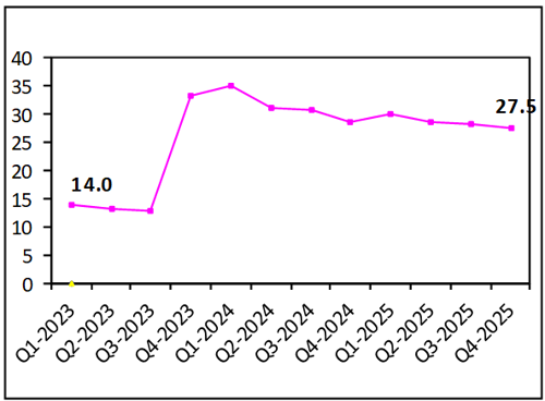 The number of unemployed persons in the West Bank reached about 280 thousand in the 4th quarter of 2025 (27.5%) compared to about 293 thousand in the 3rd quarter of 2025 (28.5%).