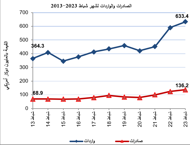 | النتائج الأولية للتجارة الخارجية المرصودة للسلع لشهر شباط، 02/2025 | 23/04/2025 | |