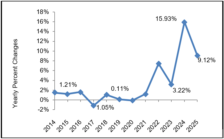 Sharp Increase in Wholesale Price[1] Index by 9.12% during 2025