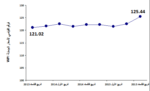 سجل الرقم القياسي العام لأسعار الجملة ارتفاعاً حاداً بنسبة 2.35% خلال الربع الثالث 2015 مقارنة بالربع الثاني 2015، حيث بلغ الرقم القياسي العام لأسعار الجملة 125.44 خلال الربع الثالث 2015 مقارنة بـ 122.57 خلال الربع السابق (سنة الأساس 2007=100).