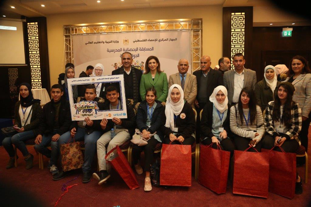 رام الله 24-12-2018 وفا- اختتم الجهاز المركزي للإحصاء الفلسطيني، بالتعاون مع وزارة التربية والتعليم، اليوم الاثنين بمدينة رام الله، المسابقة الاحصائية المدرسية "مستقبلي في أرقام"، بمشاركة 20 طالبا وطالبة من الضفة الغربية وقطاع غزة وصلوا للمرحلة النهائية.وشارك في المسابقة التي تأتي بدعم من صندوق الأمم المتحدة للسكان، ومنظمة الأمم المتحدة للطفولة، حوالي 300 طالب وطالبة من صفوف التاسع والعاشر، من 100 مدرسة في كل من الضفة وغزة، تم اختيارهم بناء على معايير محددة من قبل وزارة التربية، حيث يقوم الطلبة بالإجابة على اسئلة تتعلق بمواضيع احصائية عبر موقع جهاز الاحصاء، وتأهل للمرحلة الأخيرة 20 طالب وطالبة.