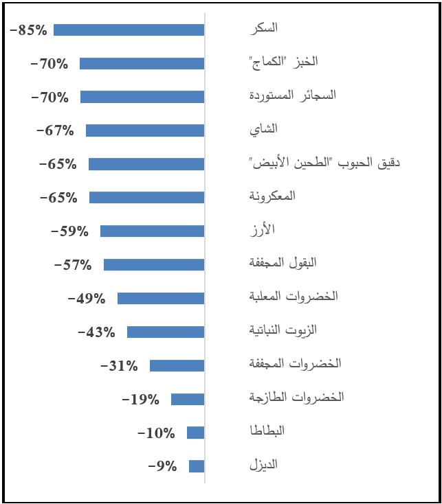 انخفضت أسعار السلع الآتية بشكل ملحوظ في قطاع غزة لتبلغ بالمتوسط؛ السكر 13 شيكلاً/كغم، وخبز كماج 18 شيكلاً/كغم، وسجائر رويال 120 شيكلاً/علبة 20سيجارة، والشاي 10 شواكل/باكيت 100كيس، والطحين 5 شواكل/كغم، ومعكرونة 2 شواكل/350غم، والأرز 6 شواكل/كغم، والعدس المجروش 5 شواكل/كغم، وعلبة فول 8 شواكل/380 غم، وزيت عباد الشمس 57 شيكلاً/3 لتر، والبصل الجاف 61 شيكلاً/كغم، والثوم الجاف 149 شيكلاً/كغم، والبندورة 75 شيكلاً/كغم، والكوسا 46 شيكلاً/كغم، والباذنجان 14 شيكلاً/كغم، والخيار 28 شيكلاً/كغم، والبطاطا 32 شيكلاً/كغم، والسولار 106 شيكلاً/لتر.