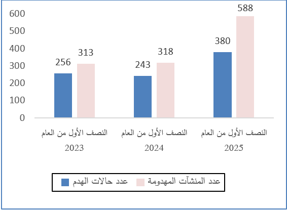 عدد عمليات الهدم والمنشآت المهدومة من قبل الاحتلال الإسرائيلي في الضفة الغربية خلال النصف الأول من الأعوام 2023-2025