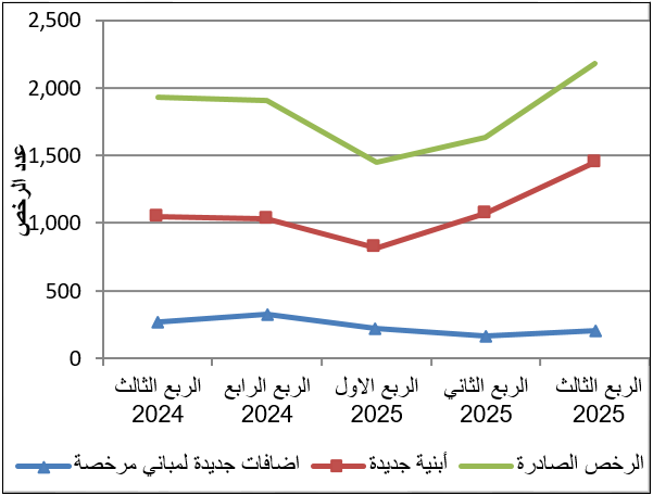 بلغ عدد رخص الأبنـية الصادرة للمباني السكنيـة وغير السكنيـة 2,184 رخصة خلال الربع الثالث من العام 2025، منها 1,452 رخصة أبنية جديدة.
