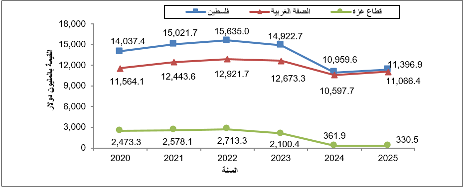 فقد سجل الناتج المحلي الإجمالي خلال عام 2025 انخفاضاً حاداً في قطاع غزة بلغت نسبته 84% مقارنة بالعام 2023، في حين تراجع في الضفة الغربية بنسبة 13% خلال الفترة ذاتها. ورغم تسجيل الضفة الغربية ارتفاعاً محدوداً بنسبة 4.4% في عام 2025 مقارنة بالعام 2024، إلا أن الناتج المحلي في قطاع غزة واصل الانكماش ليسجل تراجعاً إضافياً بنسبة 8.7% خلال نفس الفترة.