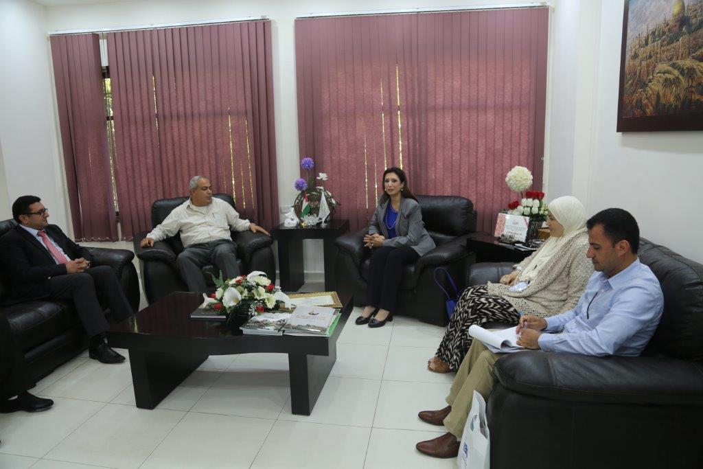 طولكرم – 28/08/2017 - استقبلت إدارة جامعة فلسطين التقنية خضوري اليوم، في مقرها الرئيس بطولكرم معالي السيدة علا عوض، رئيس الإحصاء الفلسطيني/ المدير الوطني للتعداد، وذلك لبحث سبل التعاون المشترك وللتأكيد على أهمية العمل التكاملي ما بين الجامعة والإحصاء الفلسطيني في إنجاح التعداد العام للسكان والمساكن والمنشآت 2017، وتعظيم الفائدة من الدراسات والإحصاءات الوطنية في الأبحاث العلمية والدراسات المختلفة، وذلك بحضور مساعدي الرئيس د. ضرار عليان و د. إيهاب القبج وعمداء الكليات والعمادات المساندة والوفد المرافق من الاحصاء الفلسطيني.