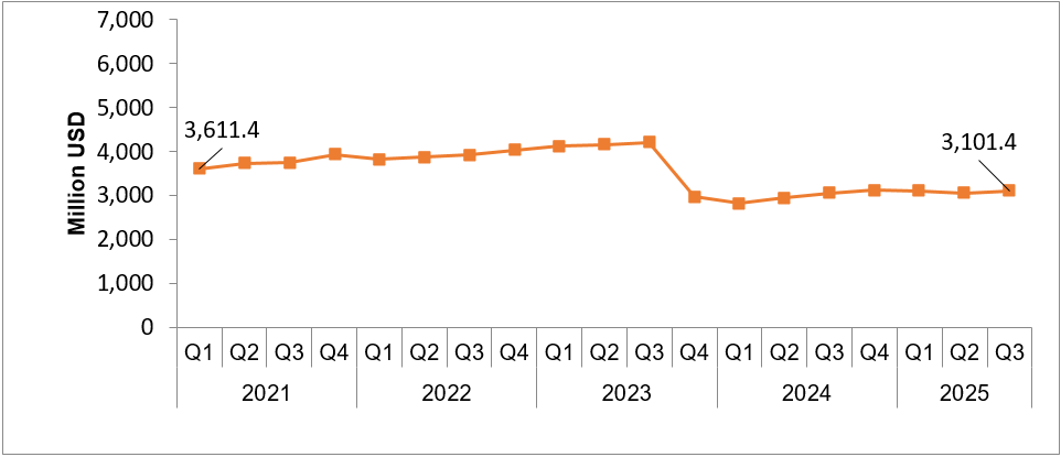 Primary estimates of GDP showed a sharp decline in the GDP of Palestine during the 3rd quarter of 2025 compared to the 3rd quarter of 2023, where most of economic activities recorded a sharp decline in value-added in Palestine, as construction activity declined by 27% (13% in the West Bank and 99% in Gaza Strip), agriculture, forestry and fishing activity declined by 16% (93% in Gaza Strip), wholesale and retail trade declined by 26% (16% in the West Bank and 90% in Gaza Strip). On the other hand, some of economic activities witnessed an increase in Palestine during the 3rd quarter of 2025 compared to the same quarter of 2024. Whereas the GDP for the 3rd quarter of 2025 was USD 3,026 million in the West Bank and USD 75 million in Gaza Strip.