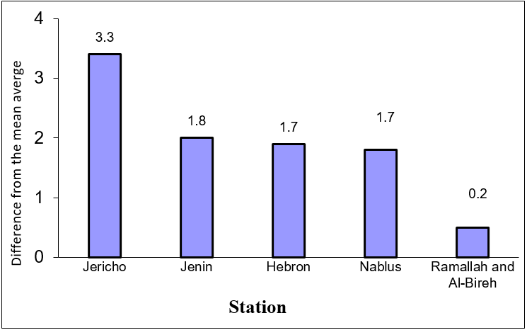 Jericho Station exceeds the evaporation mean average, while Nablus has the lowest.