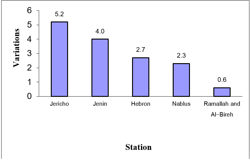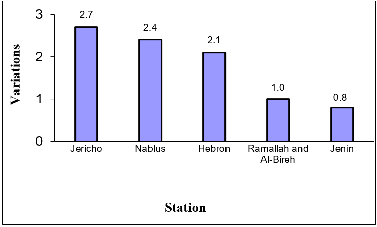 In 2025, maximum temperatures varied across the West Bank stations, showing notable variation, where Jenin Station witnessed a temperature increase of approximately 0.8°C higher than the mean average, while Jericho Station recorded a difference of 2.7°C.